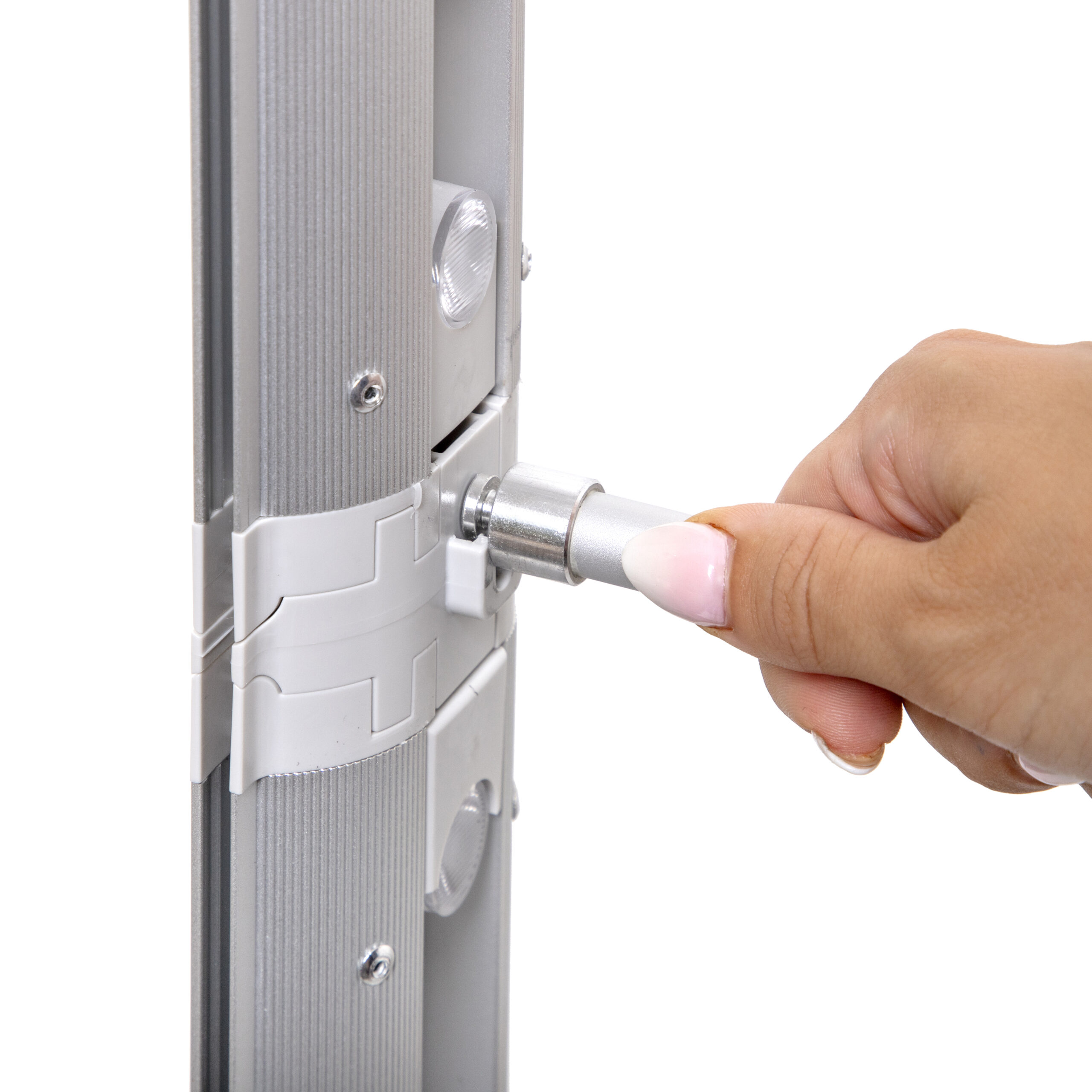 A panelcsere mostantól egyszerűbb. Nem kell az állványt visszaszállítani a grafika cseréhez, az új textil panel összehajtva akár egy borítékban is elküldhető a felhasználási helyre. Ott egy perc alatt feltehető az állványra, így az eszköz folyamatosan használatban maradhat.